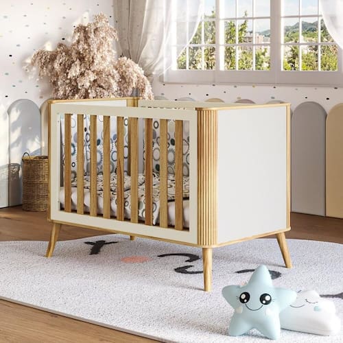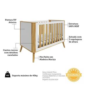 Berço Minicama Americano 3 em 1 Luly 100% Mdf Espresso Móveis Off White/Amêndoa. Crie um ambiente acolhedor e cheio de charme com móveis no estilo retrô. Com detalhes no acabamento e pés palito em madeira natural, a linha Luly traz um toque nostálgico, perfeito para quem busca elegância atemporal. O Berço é fabricado 100% em MDF e possui pintura atóxica. Seu estrado possui altura regulável, e as grades e molduras possuem bordas arredondadas e laqueadas, proporcionando uma sensação agradável ao toque. Acompanha suporte de cortinado. Ideal para pais que valorizam design clássico e boa qualidade.