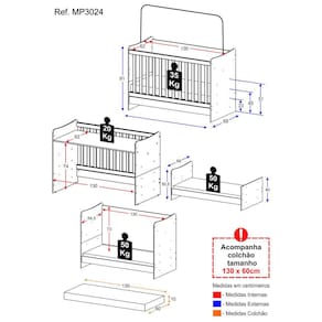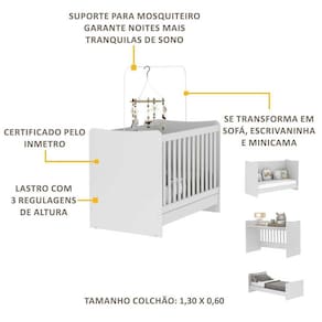 Além disso, este berço é certificado pelo INMETRO seguindo rigorosos padrões de segurança. Sua versatilidade é um dos grandes diferenciais: ele pode ser transformado facilmente em sofá, minicama e até mesmo uma prática escrivaninha acompanhando as necessidades do ambiente e da criança. Padrão nacional (tamanho do colchão 130 x 60cm), o berço acompanha um colchão densidade D18 que possui tratamento anti-ácaro e anti-alérgico - perfeito para proteger a saúde dos pequenos. Suporta até 50kg e é certificado pelo INMETRO sob o Selo n° 007249/2020.