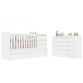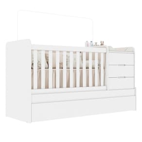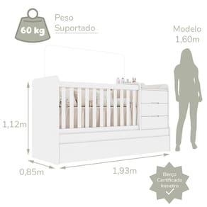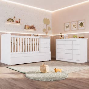 O Berço Multifuncional Cléo com Cômoda Fraldário da Carolina Baby é a escolha ideal para quem busca praticidade, segurança e um quarto de bebê completo. Produzido em MDF com pintura UV atóxica, oferece durabilidade e acabamento moderno que combina com diferentes estilos de decoração. O berço possui estrado com regulagem de altura e pode ser transformado em mini cama, acompanhando o crescimento da criança. A cômoda conta com 5 gavetas espaçosas e 1 porta com prateleira, ideal para organizar roupas, fraldas e acessórios. O tampo funciona como fraldário, trazendo mais praticidade para a rotina. Um conjunto funcional, seguro e pensado para proporcionar conforto ao bebê e mais organização para os pais. Acabamento: Pintura UV Acabamento da Gaveta: Pintura Acabamento da Porta: Pintura Acabamento da Prateleira: Pintura Acompanha Cama Auxiliar: Sim Acompanha Móbile: Não Acompanha Suporte para Mosquiteiro: Não Altura: 112 cm Altura do Estrado até o Chão: 60 cm Ambiente Principal: Quarto Cama Auxiliar Acompanha Colchão: Não Cama Auxiliar com Rodízio: Sim Cama Auxiliar Suporta Até (kg): 60 kg Certificado: Berço: Inmetro 012553/2025, Mini berço: Inmetro 012551/2025 codigo_ean: 7900288369529 Complexidade da Montagem: Baixa: pode ser montado por uma pessoa sozinha Cor: Branco Cor do Produto: Branco Escala de Brilho: Fosco Escala de Brilho da Gaveta: Fosco Escala de Brilho da Porta: Fosco Escala de Brilho da Prateleira: Fosco Estilo: Moderno Estrado com Regulagem de Altura: Sim Estrado Regulável em Quantas Posições: 02 Gaveta com Chave: Não Itens Inclusos: 1 Berço Multifuncional, 1 Cômoda, Manual de Montagem e Kit Ferragem Largura: 193 cm Linha ou Coleção: Cleo Manual de Montagem e Instalação: https://product-hub-prd.madeiramadeira.com.br/972709475/documents/cfa77062-5121-4f89-8c2f-7d17daa893573433009671617727294678272.pdf Marca: Carolina Baby Material da Gaveta: MDF Material da Grade: MDF Material da Porta: MDF Material da Prateleira: MDF Material do Estrado: MDF Material Principal: MDF Multifunção Flex: Cama, Cama Auxiliar, Mini comoda Necessita Montagem: Sim Opções de Altura do Estrado: 60 cm do chão (posição mais alta – indicada para recém-nascidos) 30 cm do chão (posição mais baixa – para quando o bebê começa a sentar ou levantar) Origem do Produto: Nacional Permite a Utilização de Cama Auxiliar: Sim Peso: 108,9 kg Peso Máximo por Gaveta: 5 kg Peso Máximo por Prateleira: 5 kg Pintura Atóxica: Sim Portátil: Não Possui Gavetas: 08 Possui Pés: Não Possui Portas: 01 Possui Prateleiras: 01 Profundidade: 85 cm Recomendações de Uso, Manutenção e Limpeza: Limpar com pano seco Sistema Anti-Refluxo: Não Sistema de Montagem: Parafusos Suporta Até (kg): 60 kg Tamanho do Colchão Indicado (L x C): 70 x 130 cm Tamanho do Colchão Indicado Cama Auxiliar: 70 x 130 cm Tipo de Berço: Berço Americano Tipo de Corrediça da Gaveta: Metálica Telescópica Tipo de Dobradiça/Corrediça da Porta: Metálica Tipo de Estrado: Removível Tipo de Grade: Fixa Tipo de Porta: Abrir Tipo de Puxador da Gaveta: Embutido Tipo de Puxador da Porta: Externo