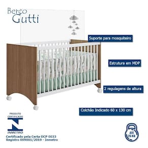Decore o cantinho do bebê com um móvel que irá garantir conforto e noites tranquilas! Apresentamos o Berço Nacional Gutti, desenvolvido pela Móveis Estrela. Acompanha suporte para mosquiteiro, colchão Gazin na medida 60x130cm, possui 2 regulagens de altura e suporta até 25kg. Ainda conta com um design minimalista e moderno, Kit rodízios, acabamento em pintura uv e estrutura em MDP resistente e de alta durabilidade, garantindo a utilização por muito mais tempo. Confira mais detalhes abaixo, compre com a gente e receba no conforto de sua casa!