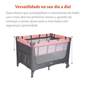 Super completo e portátil com trocador e capota removíveis, prático para o dia a dia dos pais, também pode ser utilizado como cercado. Colchonete macio e mosquiteiro elevado.