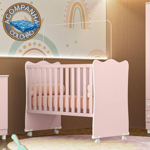 Berço Simples Doce Sonho 1 c/ rodízios Qmovi Rosa Acetinado + Colchão Ortobom - Rosa Claro