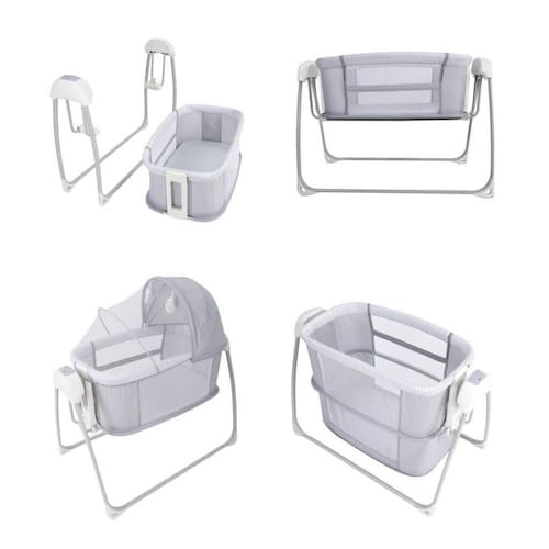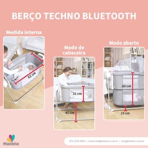 O Berço Techno Bluetooth é o mais completo do mercado. Ele é recomendado desde RN até 13,600Kg. Possui 5 velocidades de balanço, timer de 15, 30 e 45 minutos e após inatividade por 60 minutos ele desliga automaticamente. O Berço é versátil, possui duas alturas reguláveis, o cesto pode ser removido, transformando-o em um moisés. A lateral abaixa possibilitando que o berço seja acoplado à cama dos pais. A capota vem com móbile de brinquedos em plush e mosquiteiro acoplado. A base possui rodinhas com trava de segurança e pés antiderrapantes. Possui painel de controle touch screen, interação por controle remoto e bluetooth dando a opção colocar uma playlist personalizada para o bebê. Possui 15 melodias. Estrutura dobrável, facilitando o transporte. Vem com cabo USB sem adaptador e tem compartimento para 4 pilhas "AA" (Não Inclusas).
