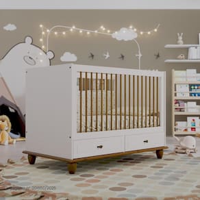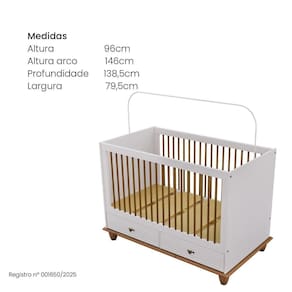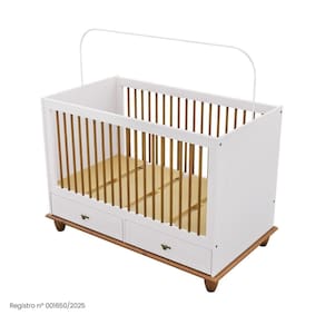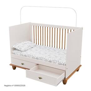 Berço Vira Cama em Mdf 96cm X 79,5cm Joy Off White/Nogueira. O Berço Mini Cama Joy é a escolha perfeita para garantir o conforto e a segurança do seu bebê. Com design moderno, se adapta a qualquer estilo de quarto infantil.Base de madeira maciça reflorestada, com espessura de 25cm; frentes de gaveta em baixo relevo; acabamento laca; pintura atóxica; ferragens padrão ouro velho envelhecido; pés robustos e torneados de madeira maciça; três regulagens de altura do estrado, transforma-se em mini cama. Cada curva, cada detalhe, é um compromisso com a beleza e a responsabilidade ambiental. Uma peça que une a elegância da natureza à sustentabilidade, tornando seu espaço mais bonito e o planeta mais verde. Um móvel perfeito para o quarto do bebê, que alia conforto, qualidade e durabilidade.