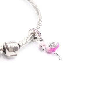 A tendência que não pode faltar na sua pulseira O Berloque Pingente Flamingo é perfeito para representar o clima tropical e o verão, além de ser tendência da estação. O flamingo é esmaltado em dois tons de rosa: um rosa claro que vai do bico até o final do pescoço, e um escuro, que cobre toda parte de baixo da ave. Os tons de rosa, típicos do flamingo, trazem um ar romântico e alegre para a peça. Além disso, a plumagem da asa do flamingo é colorida por pedrinhas de zircônia rosa claro e cristal. Os detalhes, como no bico, olhos e penas, trazem todo um encanto para o berloque. As pernas prateadas em diferentes posições, uma dobrada e a outra esticada, traz toda a graciosidade para a peça. E para deixar esse berloque ainda mais elegante, seu passador prateado é todo cravejado com pedrinhas de zircônia rosa claro. O berloque é igual de ambos os lados. Ouse nas combinações e deixe sua pulseira incrível com esse berloque Por ele ser estilo pingente fica lindo entre dois separadores.. O acabamento e polimento são feitos de forma manual e individual, revelando todo o cuidado que temos com cada detalhe. Portanto, não se engane com materiais folheados e banhados. Esse berloque é compatível com todas as pulseiras do mercado. No entanto, caso ainda tenha dúvidas, basta medir a espessura da sua pulseira. O passador desta peça tem 4,5mm de diâmetro. Material: Prata 925, Zircônias e esmalte. Cor: Prata, rosa, rosa claro e preto. Medidas: 26mm de altura x 13mm de largura. Passador com 4,5mm de diâmetro. Compatível com todas as marcas tradicionais de pulseiras de berloques. Marca: Mundo Briller Ean: 7807108964530