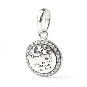Tem que ter muito amor para ir até a lua e volta pela pessoa amada, este pendente representa tudo este amos. Berloque estilo pendente com os dizeres I Love You to the Moon and Back fabricado em prata 925 com pedras, muito delicado. não se engane com materiais folheados e banhados. Acabamento e polimento manuais.