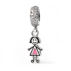 Como um desenho infantil, essa menininha sorri docemente com o seu vestidinho rosa. O passador com diversas Zirconias deixam a peça mais encantadora. Represente aquela criança especial na sua coleção. Berloque estilo pendente é fabricado em Prata 925 e esmalte. Não se engane com materiais folheados e banhados. Acabamento e polimento manuais. Material: Prata 925 e esmalte. Cor: Prata, rosa e preto. Medidas aproximadas: 25mm de altura x 3mm de largura. Compatível com todas as pulseiras. Marca: Não Informado