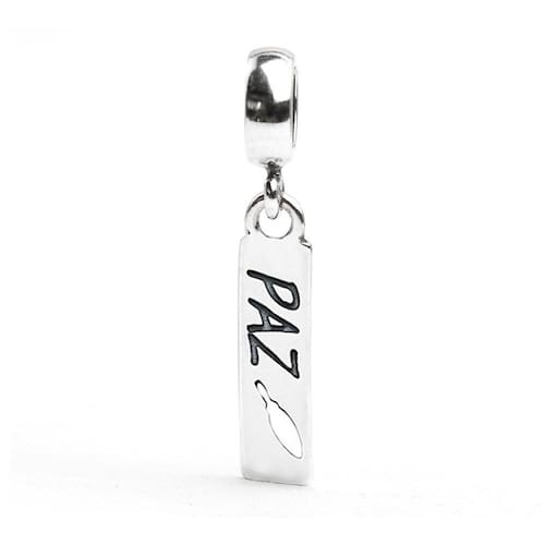 Berloque estilo pendente fabricado em Prata 925 em formato de plaquinha escrito Paz em tom de prata envelhecida. Não se engane com materiais folheados e banhados. Acabamento e polimento manuais. Material: Prata 925. Cor: Prata. Medidas aproximadas: 25mm de altura x 5mm de largura. Compatível com todas as marcas tradicionais de pulseiras de berloques. Marca: Mundo Briller Ean: 7899057812437