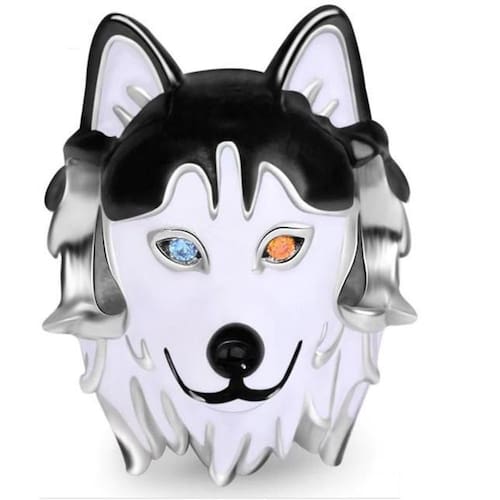 Olha que imponente Os olhos, um de cada cor, marcam bem esta raça, peça esmaltada em branco e preto, traz muita realidade para esta peça. Berloque estilo separador fabricado em Prata 925. Não se engane com materiais folheados e banhados. Acabamento e polimento manuais.