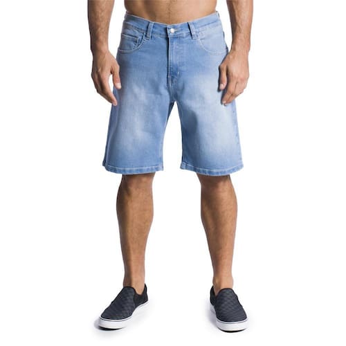Walkshorts denim azul, five pockets, em tecido com algodão com elastano, modelagem straight fit (regular), com etiquetas personalizadas.