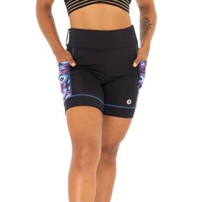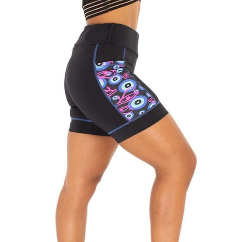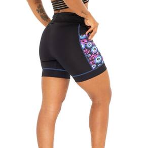 Bermuda de compressão preta com 2 bolsos laterais estampa olho grego e passantes na cintura para cinto de hidratação. Desenvolvida para corrida de rua, maratona, trail running, corrida de montanha.