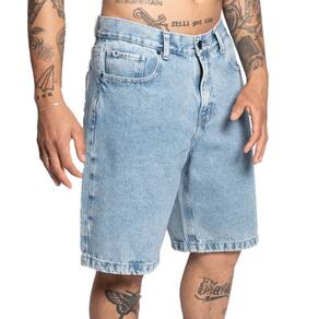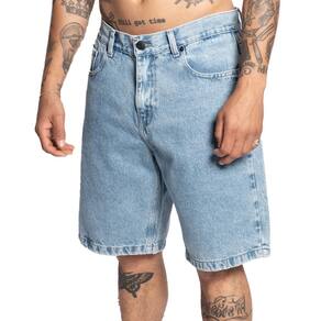 Bermuda Dc Shoes five pockets feita em modelagem oversize, lavanderia leve com marcações nas costuras e etiquetas personalizadas.