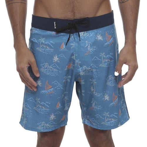 Bermuda Hurley com tecido de elastano, estampa sublimada, tape lateral, patch Icon na lateral, bolso traseiro e etiquetas personalizadas.