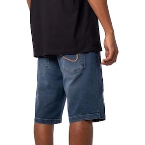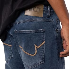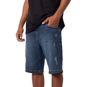 Bermuda Mcd feita em modelagem Slim fit, denim escuro com elastano, detalhes desbotados, lavagem marmorizada, bolsos laterais embutidos com bolso isqueiro interno, bolsos traseiros com detalhe espada bordado, fechamento em zíper e botão, detalhes desbotados e passantes para cinto.