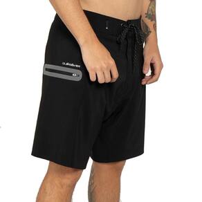 Bermuda QuikSilver feita em tecido 2Way, com elasticidade para os dois lados, repelente à água, cós duplo do próprio tecido, cordão chato especial, bolso fusionado lateral com fechamento em zíper invertido anti corrosivo e com aplicação de transfer, etiqueta aplicada na perna esquerda e tecido telado no interno do bolso com aplicação de elástico para chaves.