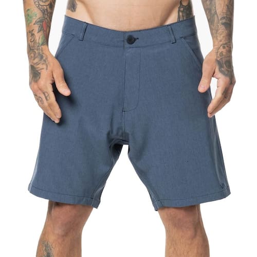 Bermuda Rvca hybrid em tecido com alta elasticidade, 18", fechamento em botão de massa, bordado VA na perna, bolso traseiro embutido e etiquetas personalizadas da marca.