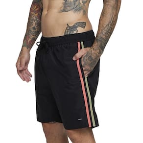 Bermuda Rvca com comprimento de 18 polegadas, cós de elástico com cordão de ajuste, bolso lateral embutido na costura, bolso traseiro com fechamento em fitas duplas aderentes, com faixas aplicadas nas laterais e patch aplicado na perna.