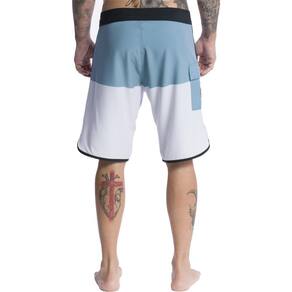 Boardshort com alta elasticidade, comprimento de 19 poelgadas, fechamento em cordão de ajuste externo, laterais e barras com viés aplicado, bolso lateral com lapela e patch de logotipia aplicado, estampa logo na perna e etiquetas personalizadas.