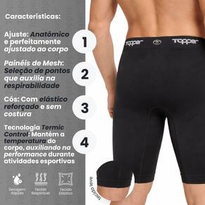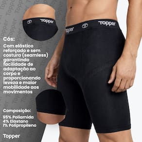 - Marca: Topper - Composição: 95% Poliamida/ 4% Elastano/ 1% Polipropileno - Modelo: Bermuda Térmica Masculina - Gênero: Masculino - Modelagem: Ajustada / Compressão - Comprimento: Acima do joelho - Indicação: Treino, ciclismo, corrida, futebol, academia e atividades esportivas - Costura: Sem Costura ( seamless ) - Painéis de Mesh: Seleção de pontos que auxilia na respirabilidade - Cós: Com elástico reforçado