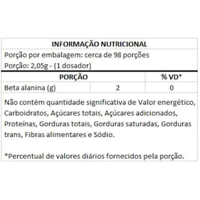 Beta Alanina 200g - Canibal Composição do Anúncio 1x- beta Alanina 200g - Canibal Descrição do Anúncio Potencialize seus treinos com a Beta Alanina Canibal Inc., um suplemento de alta pureza desenvolvido para atletas que buscam mais resistência, explosão e desempenho físico. Ao aumentar os níveis de carnosina nos músculos, a beta alanina retarda a fadiga, permitindo treinos mais longos, intensos e eficazes. Com fórmula 100% pura, sem aditivos, cada porção fornece a dose ideal para quem deseja elevar o nível dos treinos e acelerar os resultados. Benefícios -aumenta a resistência muscular; -retarda a fadiga e melhora o desempenho físico; -ideal para treinos de alta intensidade musculação, treinamento funcional, HIIT, etc. ; -fórmula pura - sem conservantes, sem corantes; -excelente rendimento: até 98 porções por embalagem. Modo de preparo: Adultos maiores de 18 anos, consumir 2,05g diluído em 150ml de água ou bebida da sua preferência ao dia, ou de acordo com orientação . Modo de conservação: Conservar este produto bem fechado, em lugar fresco, seco e ao abrigo da luz. Após aberto, consumir em até 60 dias. Marca: Não Informado