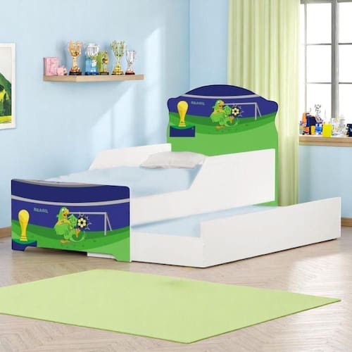 Bi Cama Infantil Kmcb com Proteção Lateral Estrutura Madeira Reforçada Futebol Adesivo Vinil Resistente