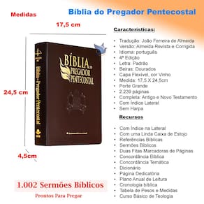 A Bíblia do Pregador Pentecostal é única Bíblia com sermões prontos junto ao texto bíblico, além de curso básico de Teologia. Seu principal objetivo é colocar à disposição de todos os obreiros uma ferramenta prática e de conteúdo rico para o exercício do ministério cristão. São 1.002 sermões bíblicos, que servirão de auxílio e orientação para pregações voltadas aos mais diversos públicos e ocasiões. Especialmente elaborados pelo teólogo e pastor Erivaldo de Jesus, os sermões abordam cada um dos 66 livros da Bíblia, além de tratarem de temas para ministrar a Palavra de Deus em convenções de pastores, reuniões de obreiros, escolas bíblicas, reuniões para mulheres e festividades em geral da Igreja. Cada sermão é subdividido em variados tópicos e referências bíblicas acerca do tema abordado e possui os três elementos fundamentais do princípio da homilética, que é a arte de pregar: introdução, explanação e conclusão. A publicação oferece, ainda, um curso básico de Teologia, composto de 12 matérias teológicas, que dará uma pequena noção do que é Teologia e sua importância para o crescimento espiritual, intelectual e bíblico de todos os estudantes da Bíblia Sagrada. Numa sociedade em que as pessoas vivem sempre correndo e com o tempo cada vez mais escasso para realizar todas as tarefas que têm de desempenhar, esta edição da Bíblia Sagrada tem o objetivo de facilitar a vida de pastores e pregadores, oferecendo um caminho, uma luz, para que desenvolvam os temas que desejam trabalhar em seus sermões, de uma forma prática e rápida.