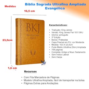 Tradução: King James Versão: King James Fiel 1611 BKJ Idioma: português Letra: Padrão 3ª Edição Beiras: Prateadas Capa Flexível em Material Sintético PU, cor Mostarda Medida: 16,5 X 23,5 X 1,6cm 758 páginas Porte Médio Ultrafina (Slim) ampliada Completa: Antigo e Novo Testamento Sem Harpa