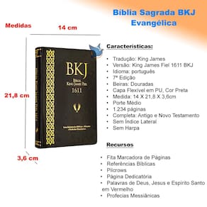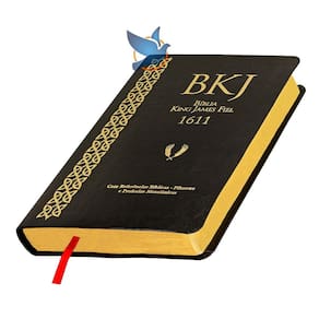 Bíblia Sagrada traduzida por King James, versão King James Fiel 1611. Capa flexível em material sintético PU, cor Preta. Porte Grande, possui 1.248 páginas. Letra Padrão. Com fita marcadora de páginas. Não é versão de Estudo. Bíblia Completa com Antigo e Novo Testamento.