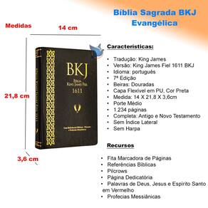 Tradução: King James Versão: King James Fiel 1611 BKJ Idioma: português Letra: Padrão 7 Edição Beiras: Douradas Capa Flexível em Material Sintético PU, Cor Preta Medida: 14 X 21,80 X 3,6cm 1.248 páginas Porte Grande Completa: Antigo e Novo Testamento Sem Índice Lateral Sem Harpa