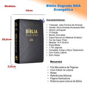 Tradução: João Ferreira de Almeida Versão: naa Nova Almeida Atualizada Idioma: português Beiras: Douradas Capa Flexível em Material Sintético, cor Preta Letra Gigante Medidas: 14 x 20,60cm 1.791 páginas Porte Médio 3 Edição Com Índice Lateral