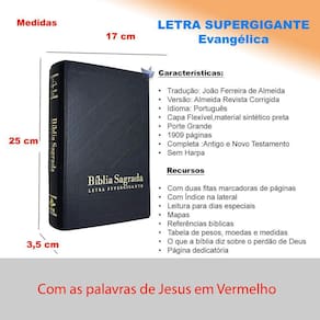 Bíblia Sagrada Letra Supergigante ARC Índice Lateral Preta B1415 Medidas 17x25x3,5cm, 1.909páginas, Palavras de Jesus em Vermelho, com Índice Lateral, sem harpa.Bíblia Sagrada LETRA SUPERGIGANTE, Tradução João Ferreira de Almeida, Versão: Almeida Revista Corrigida ARC , Capa em Material Sintético na cor Preta. Ideal para quem deseja ler a Palavra de Deus diariamente. Com tamanho de letra Supergigante e palavras de Jesus impressas em vermelho, este modelo da Bíblia Sagrada oferece mais conforto na leitura, especialmente ao grupo da terceira idade ou àquelas pessoas com problemas leves de visão. Características: Tradução João Ferreira de AlmeidaVersão: Almeida Revista e CorrigidaIdioma: portuguêsBeiras douradasCapa flexível em Material sintéticoMedida: 17,0 X 25 cmPorte Grande1.920 páginasCom índice lateralCom 2 fitas marcadoras de páginasCompleta: Antigo e Novo TestamentoSem Harpa RecursosComo encontrar ajuda na BíbliaLeituras para dias especiaisMapas Referência bíblicasO que a Bíblia diz sobre o perdão de DeusPalavras de Jesus impressas em VermelhoTabela de pesos, moedas e mediasPágina dedicatória