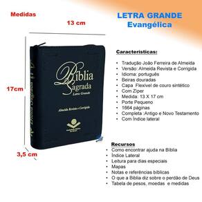 Bíblia Sagrada, traduzida por João Ferreira de Almeida, versão ARC Almeida Revista e Corrigida. Capa em Material Sintético Preta, Com Zíper. Possui índice na lateral. Porte pequeno, 1.664 páginas, letra grande. Incluso diversos recursos como: notas e referências bíblicas, mapas, tabela de pesos e moedas, leitura para dias especiais.