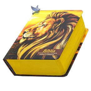 A Bíblia Sagrada na tradução de João Ferreira de Almeida, versão ARC Almeida Revista e Corrigida. Com Capa Dura Ilustrada, modelo Leão Paisagem, sendo Full Color. Acompanha Harpa Cristã e Corinhos. Palavras de Jesus em Vermelho e Palavras de Deus em Azul. Porte Pequeno Compacta, ideal para carregar na bolsa . Bíblia Completa: Antigo e Novo Testamento.
