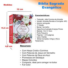 Tradução: João Ferreira de Almeida Versão: almeida Revista e Corrigida ARC Idioma: português Beiras: Vermelhas Capa Dura Ilustrada Arranjo Flores, cor Full Color Letra Padrão Medidas: 15,2 x 12cm 1.215 páginas Porte Pequena 1 Edição Com Harpa Cristã Sem Índice Lateral