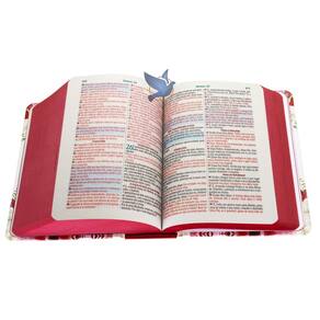 A Bíblia Sagrada na tradução de João Ferreira de Almeida, versão ARC Almeida Revista e Corrigida. Com Capa Dura Ilustrada, modelo Arranjos Flores, sendo Full Color. Acompanha Harpa Cristã e Corinhos. Palavras de Jesus em Vermelho e Palavras de Deus em Azul. porte Pequeno Compacta para transportar na bolsa . bíblia Completa: Antigo e Novo Testamento.
