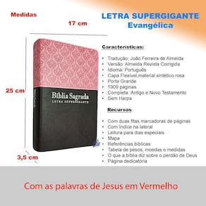 Com tamanho de letra Supergigante e palavras de Jesus impressas em vermelho, este modelo da Bíblia Sagrada oferece mais conforto na leitura, especialmente ao grupo da terceira idade ou àquelas pessoas com problemas leves de visão.