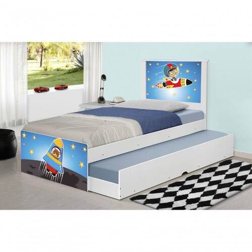 A Bicama Juvenil Barcelona Adesivada Astronauta é belíssima e conta com um design funcional, que ocupa pouco espaço no ambiente. A Coleção Astronauta foi desenvolvida por nossos designers oferecendo um visual exclusivo, descontraído e divertido ao ambiente. A cama auxiliar fica embaixo da principal e basta puxá-la por meio das corrediças para começar a fazer dela. É ideal para quartos pequenos e para caso precise de uma cama extra para receber um amigo, ou divida o dormitório com alguém. Feita em MDF e MDP e seu acabamento é feito com pintura UV brilhante tornando-a um produto resistente e com aspecto de novo por muito mais tempo. É uma excelente escolha para acomodar colchões de solteiro na medida de 188 cm x 88 cm de largura.