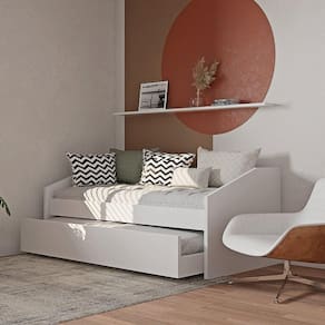 A Bicama Babá Foscarini é ideal otimizar o espaço do seu quarto. Ela conta com uma cama auxiliar, permitindo que você acomode mais pessoas no quarto, sem que muito espaço seja ocupado. Elegante e versátil, ela pode ser combinada com diversos estilos de móveis, fazendo com que seu dormitório seja muito mais prático e aconchegante, podendo também ser utilizada como sofá. É produzida 100% em MDF, seus diferenciais são notáveis na qualidade dos acabamentos e pintura em estufas modernas UV. Sua estrutura principal é de 25mm. Utiliza colchões de solteiro de 88 x 188cm. Confeccionada com materiais de alta qualidade, apresenta estrutura resistente e durável, capaz de suportar até 100 kg. Possui rodízios em sua cama auxiliar. Seu sistema de montagem é rápido, fácil e descomplicado. Aproveite! Acompanha Cama Auxiliar: Sim Acompanha Colchão: Não Altura do Estrado até o Chão: 40 Ambiente Principal: Quarto Infantil Cama Auxiliar com Rodízio: Sim Cama Auxiliar Suporta Até (kg): 100 codigo_ean: 7908243318490 Complexidade da Montagem: Média: pode ser montado por mais de uma pessoa e/ou necessite de maior conhecimento para montagem Cor: Branco Cor do Produto: Branco Escala de Brilho: Fosco Itens Inclusos: 1 Cama, Kit Ferragens e Manual de Montagem. Linha ou Coleção: Mavie Manual de Montagem e Instalação: https://product-hub-prd.madeiramadeira.com.br/878115/documents/2b44b023-ca9a-46c8-843b-7fa09d0f50b71647244228241.pdf Material do Estrado: Pinus Material Principal: MDP Necessita Montagem: Sim Origem do Produto: Nacional Permite a Utilização de Cama Auxiliar: Sim Peso: 90 Possui Baú: Não Possui Gavetas: Não Possui Pés: Não Possui Portas: Não Possui Prateleiras: Não Recomendações de Uso, Manutenção e Limpeza: Limpar com flanela ou pano macio seco, não utilizar produtos abrasivos, desengordurantes, álcool ou solvente. Não expor o produto diretamente à luz solar e à umidade. Sistema de Montagem: Parafusos, minifix e cavilhas. Suporta Até (kg): 220 Tamanho da Cama: Solteiro Tamanho do Colchão Indicado (L x C): 88 x 188 Tamanho do Colchão Indicado Cama Auxiliar: 88 x 188 Tipo de Cama: Cama Tipo de Colchão: Solteiro Tipo de Estrado: Removível Ean: 7908243318490
