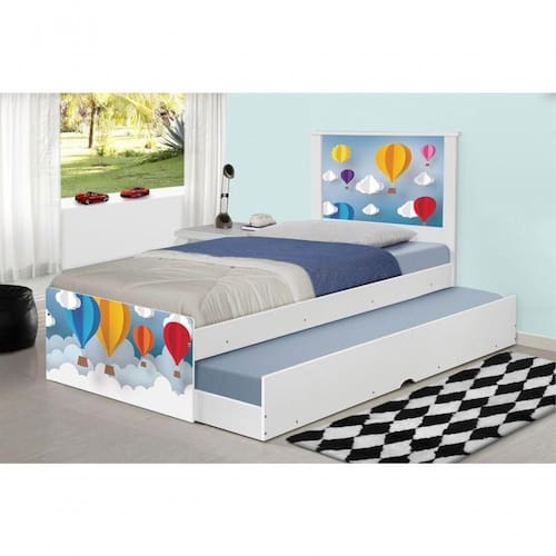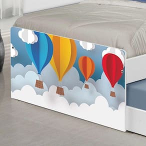 A Bicama Juvenil Barcelona Adesivada Balões é belíssima e conta com um design funcional, que ocupa pouco espaço no ambiente. A Coleção Balões foi desenvolvida por nossos designers oferecendo um visual exclusivo, descontraído e divertido ao ambiente. A cama auxiliar fica embaixo da principal e basta puxá-la por meio das corrediças para começar a fazer dela. É ideal para quartos pequenos e para caso precise de uma cama extra para receber um amigo, ou divida o dormitório com alguém. Feita em MDF e MDP e seu acabamento é feito com pintura UV brilhante tornando-a um produto resistente e com aspecto de novo por muito mais tempo. É uma excelente escolha para acomodar colchões de solteiro na medida de 188 cm x 88 cm de largura.