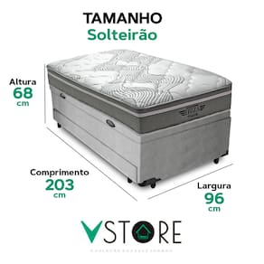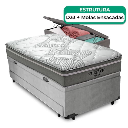 A tecnologia que a sua casa merece está na V-Store! O Conjunto Colchão Ibiza + Bicama com Cama Auxiliar e Baú da V-Store é a solução ideal para quem busca conforto, funcionalidade e praticidade. O colchão Ibiza, com Molas Ensacadas e espuma de alta performance, oferece suporte ideal e conforto intermediário, além de contar com proteção contra ácaros, fungos e alergias. A bicama combina uma cama auxiliar com espuma D28, perfeita para visitas, e um baú espaçoso para armazenamento de travesseiros, roupas de cama ou objetos pessoais, otimizando o espaço do seu quarto com elegância e organização. Transforme seu dormitório com estilo e aproveite noites ainda mais confortáveis. Verifique as dimensões para garantir compatibilidade com os acessos da sua residência.Característica Do Colchão: Modelo: IbizaMarca: V-StoreTamanho: SolteirãoDimensões: 96x22x203 (Largura x Altura x Comprimento)Conforto: intermediárioSistema: Molas EnsacadasPillow: Não se aplicaPeso Máximo recomendado: 150 kg (Por pessoa)Proteções: Antiácaro, antialérgico, antifungo, antimofoGarantia: 12 Meses (Espuma) / 10 anos ( Conjunto de Molas Ensacadas)Característica Da Base: Marca: V-StoreModelo: Bicama com BaúCor do Box: CinzaTamanho: SolteirãoDimensões: 96x44x203 (Largura x Altura x Comprimento)Estrutura: MadeiraPeso máximo recomendado: 150 kg (Por Pessoa)Altura do Box: 38 cmAltura dos Pés: 6 cmAltura total: 44 cmMedida Cama Auxiliar: 96x44x203 (LxAxC) cmGarantia: 12 Meses (Estrutura e Estofamento) / 3 Meses (Tecido)Selo Ecologicamente CorretoAtenção:- Antes de finalizar sua compra, recomendamos que verifique se as dimensões do produto são adequadas para serem transportadas pelos elevadores, portas, escadas e corredores de sua residência. Ressaltamos que não nos responsabilizamos pelo transporte do produto por meios específicos, como escadas, guinchos ou içamentos.- É possível que hajam leves variações de cor de acordo com o dispositivo que está sendo utilizado como smartphones, computadores, monitores e outros.
