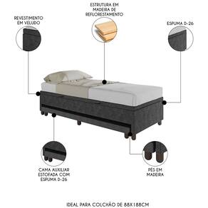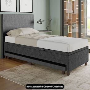 Características do Produto Material da estrutura: Madeira Reflorestada. Densidade da Espuma: Espuma D26. Peso Suportado: 300 Kg. Revestimento: Veludo. Possui Pés: Sim. Material dos Pés: Madeira. Altura dos Pés: 6 cm. Possui Rodízios: Não. É Bipartido: Não. Acompanha Colchão: Não. Acompanha Cabeceira: Não. Diferenciais: - Design moderno. - Cama auxiliar com espuma D-26. - Baú com pistão a gás e puxadores. - Arco auxiliando na fixação do colchão. - Pés de madeira. Sistema de Montagem: Parafusos. Manual de Montagem: Não. Complexidade da Montagem: Baixa. Conteúdo da Embalagem: 1 Base de cama com auxiliar. Volumes: 1 Volume. Garantia do Fabricante: 90 dias contra defeitos de fabricação. Montagem: Recomendamos que seja feita por um profissional. Recomendação de limpeza: Utilize pano levemente úmido.
