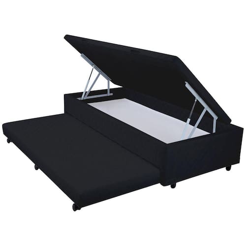 Cama auxiliar: Possui um colchão de espuma D-28 agregado a estrutura que sai de dentro do box, aproveitando assim o espaço interno do produto, podendo oferecer mais uma opção de conforto para os hóspedes. São 03 pés com rodízio(rodinhas) e 03 pés fixo.