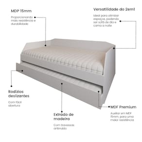 Características do Produto Tipo: Sofá Cama com Cama Auxiliar Modelo: Americana Luxo Cor: Branco Material da Cama (estrutura): MDP 15 mm Material da Cama Auxiliar: MDF Premium 15mm Acabamento: Pintura UV Sistema da Cama Auxiliar: Rodízios deslizantes Estrado: Madeira com travessas antirruído Versatilidade: Função 2 em 1 ? sofá durante o dia e cama à noite