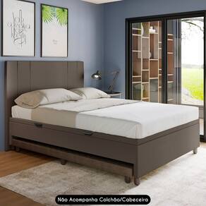 Características do Produto Material da estrutura: Madeira Reflorestada. Densidade da Espuma: Espuma D26. Peso Suportado: 300 Kg. Revestimento: Sintético. Possui Pés: Sim. Material dos Pés: Madeira. Altura dos Pés: 6 cm. Possui Rodízios: Não. É Bipartido: Não. Acompanha Colchão: Não. Acompanha Cabeceira: Não. Diferenciais: - Design moderno. - Cama auxiliar estofada com espuma D-26. - Baú com puxadores e pistão a gás. - Pés de madeira. Sistema de Montagem: Parafusos. Manual de Montagem: Não. Complexidade da Montagem: Baixa. Conteúdo da Embalagem: 1 Base de cama com auxiliar. Volumes: 1 Volume. Garantia do Fabricante: 90 dias contra defeitos de fabricação. Montagem: Recomendamos que seja feita por um profissional. Recomendação de limpeza: Utilize pano levemente úmido.