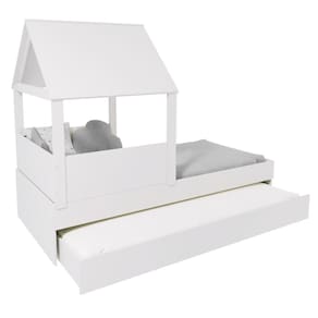 Diferenciais: Auxiliar com 4 rodízios, MDF Melamina 15mm, Estrados em Madeira Maciça, Casinha com Telhado.