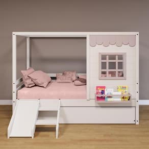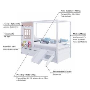 Diferenciais: Auxiliar com 4 rodízios, Kit Escada/ Escorregador, Casinha com fechamento em MDF, Janela e Prateleira para Livros e Decoração, Montagem Reversível (Lado Direito ou Lado Esquerdo)