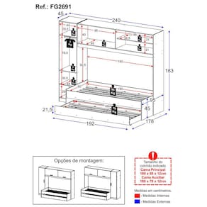Dimensões do produto montado: Bicama - Altura: 45cm | Largura: 192cm | Profundidade: 95cm Guarda-Roupas - Altura: 183cm | Largura: 240cm | Profundidade: 45cm *Você pode consultar as medidas detalhadas na imagem técnica do produto.
