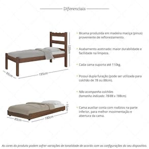 Versatilidade e conforto: A cama auxiliar, equipada com rodízios, proporciona maior facilidade no deslocamento, oferecendo ainda mais praticidade. Com dupla furação, esta bicama pode ser utilizada com colchões de 78 ou 88cm, adaptando-se facilmente às suas necessidades. NÃO acompanha colchões.