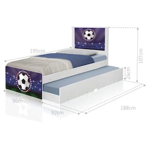 A Bicama Juvenil Barcelona Adesivada Futebol Estádio é belíssima e conta com um design funcional, que ocupa pouco espaço no ambiente. A Coleção Futebol Estádio foi desenvolvida por nossos designers oferecendo um visual exclusivo, descontraído e divertido ao ambiente. A cama auxiliar fica embaixo da principal e basta puxá-la por meio das corrediças para começar a fazer dela. É ideal para quartos pequenos e para caso precise de uma cama extra para receber um amigo, ou divida o dormitório com alguém. Feita em MDF e MDP e seu acabamento é feito com pintura UV brilhante tornando-a um produto resistente e com aspecto de novo por muito mais tempo. É uma excelente escolha para acomodar colchões de solteiro na medida de 188 cm x 88 cm de largura.