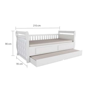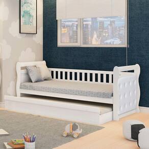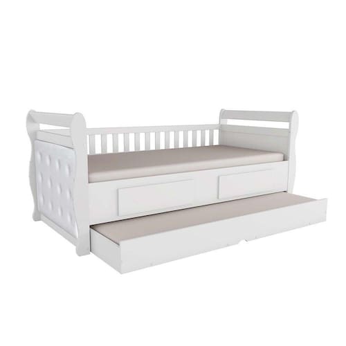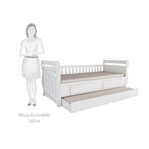 A Bicama Infantil Maria 2 Gavetas Móveis Peroba Branco é um produto 100% MDF, sua pintura é atoxica, possui as cabeceiras e grades com bordas laqueadas, cama auxiliar inclusa, estrados de madeira e kit capitonê (vendido separadamente).